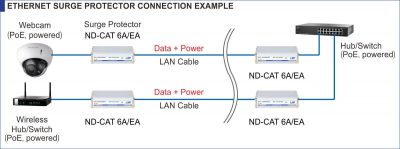 Модель LSP DT-CAT 6A /EA спеціально розроблена для захисту пристроїв зв’язку, підключених через локальну мережу Ethernet, від грозових перенапруг, що проникають через мережеві кабелі. Багатоступенева захист передбачена для всіх чотирьох пар проводів кат. 5e (1000BASE-T, 100BASE-TX і 10BASE-T) з мінімальними перешкодами, протестовані на максимальну довжину сегмента 100 метрів, як визначено в стандарті. Такий же рівень захисту забезпечується для напруги між жала /жила, використовуваного для PoE. Обидві конфігурації Режим A і Режим B можуть використовуватися для подачі живлення на захищається мережеве пристрій.