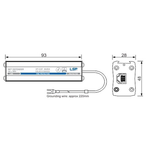 Модель LSP DT-CAT 6A /EA спеціально розроблена для захисту пристроїв зв’язку, підключених через локальну мережу Ethernet, від грозових перенапруг, що проникають через мережеві кабелі. Багатоступенева захист передбачена для всіх чотирьох пар проводів кат. 5e (1000BASE-T, 100BASE-TX і 10BASE-T) з мінімальними перешкодами, протестовані на максимальну довжину сегмента 100 метрів, як визначено в стандарті. Такий же рівень захисту забезпечується для напруги між жала /жила, використовуваного для PoE. Обидві конфігурації Режим A і Режим B можуть використовуватися для подачі живлення на захищається мережеве пристрій.